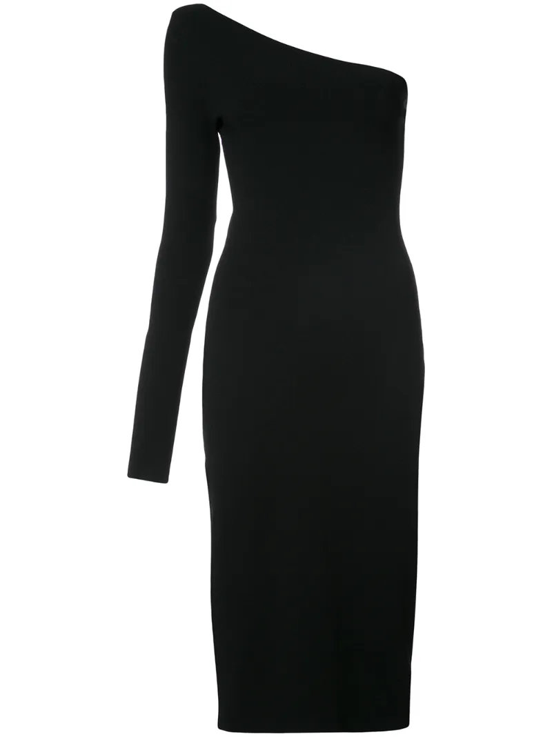 The perfect companion to your favorite oversized earrings, this one-sleeved little black dress is anything but basic. Cut in a structured poly-blend knit that holds its shape and contours the body, it is endlessly flattering and versatile. In fact this affordable Diane Von Furstenberg dress is the epitome of chic style.