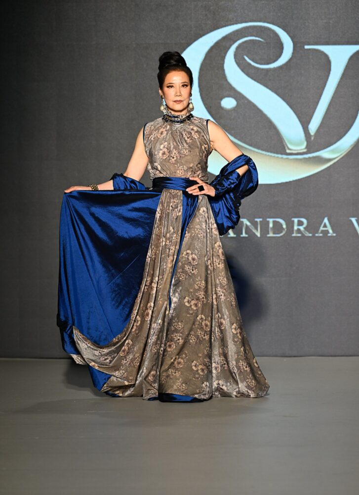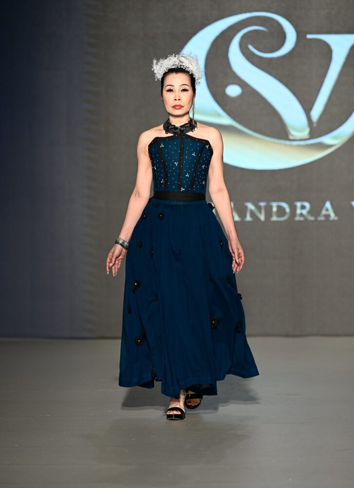 The clothes Chandra V sent down the runway are an example of pieces that fall into a confident woman's elegant wardrobe. Designer Eva Red made the wise decision to partner with mature modelling agency JANE XU MODELS for her runway show. The designer's inspiration was her mother, and the clothes convey a sense of maturity and sophistication. While not necessarily intended for older women, the designer is focused on creating classic, enduring clothing and has no interest in chasing the latest trends.